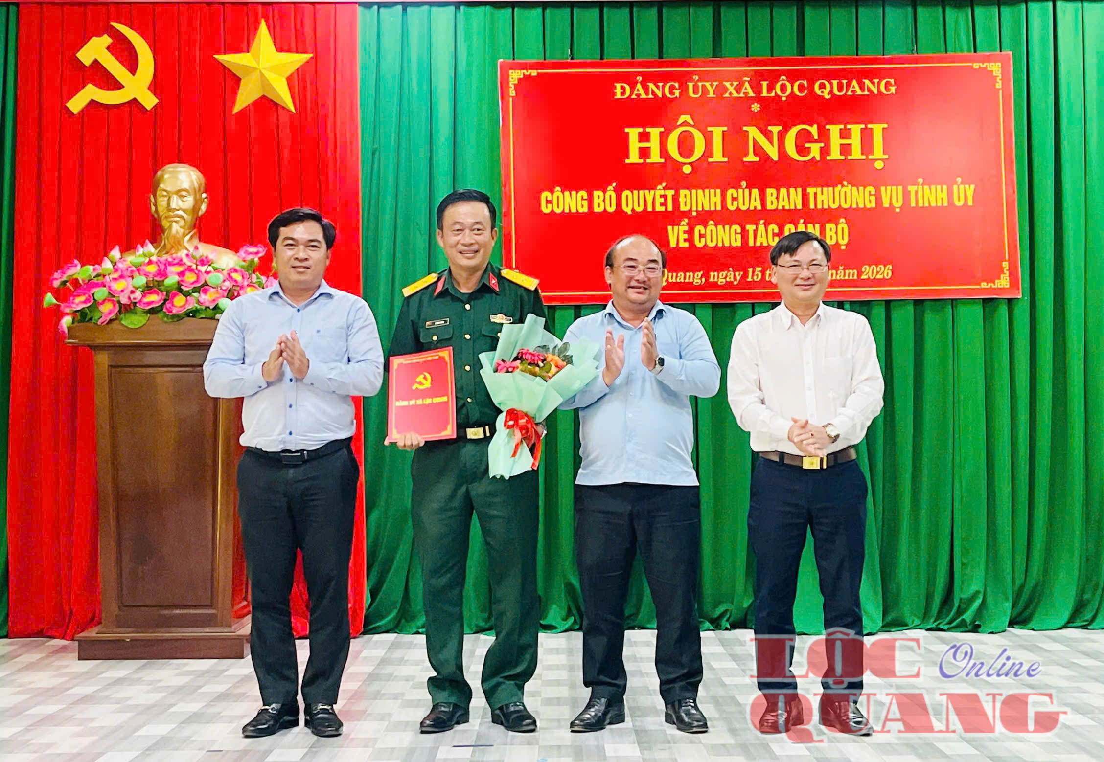 Bí thư Đảng uỷ Trần Đức Thịnh; Phó Bí thư Thường trực Đảng uỷ, Chủ tịch HĐND xã Đặng Bá Nghi; Phó Bí thư Đảng uỷ, Chủ tịch UBND xã Võ Văn Lượng trao quyết định cho đồng chí Lê Công Nhân - Chỉ huy trưởng Ban Chỉ huy Quân sự xã Lộc Quang