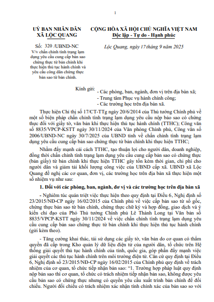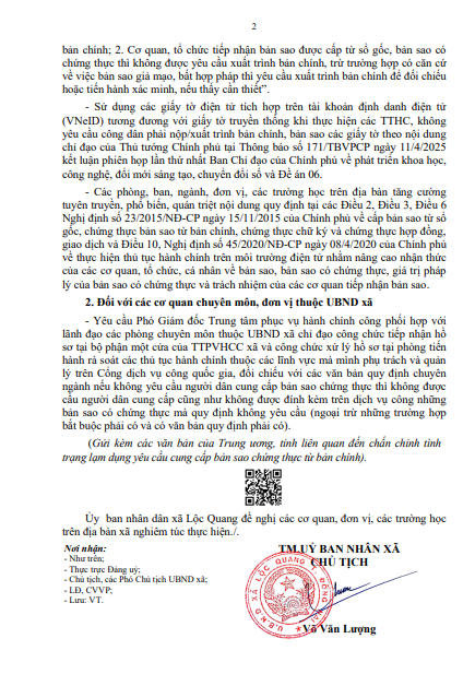 Nhằm đẩy mạnh cải cách TTHC, tạo thuận lợi cho người dân, doanh nghiệp, đồng thời chấn chỉnh tình trạng lạm dụng yêu cầu cung cấp bản sao có chứng thực (bản giấy) từ bản chính khi thực hiện TTHC gây tốn kém thời gian, chi phí cho người dân và giảm tải khối lượng công việc của UBND cấp xã. UBND xã Lộc Quang đề nghị các cơ quan, đơn vị, các trường học trên địa bàn xã thực hiện một số nhiệm vụ như sau: