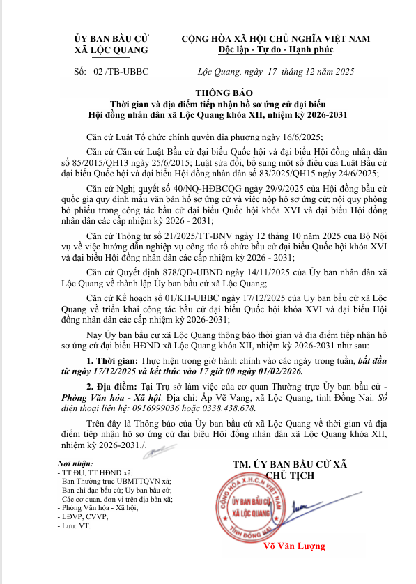 THÔNG BÁO THỜI GIAN VÀ ĐỊA ĐIỂM TIẾP NHẬN HỒ SƠ ỨNG CỬ ĐẠI BIỂU HỘI ĐỒNG NHÂN DÂN XÃ LỘC QUANG KHÓA XII, NHIỆM KỲ 2026-2031