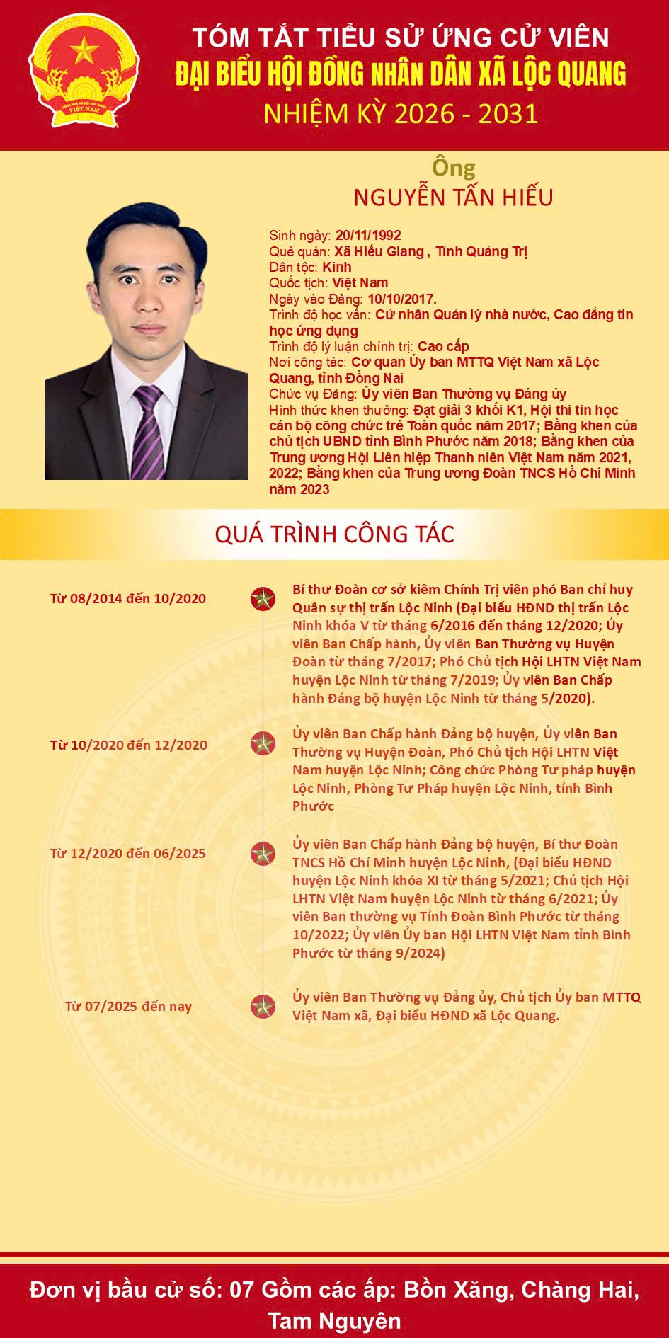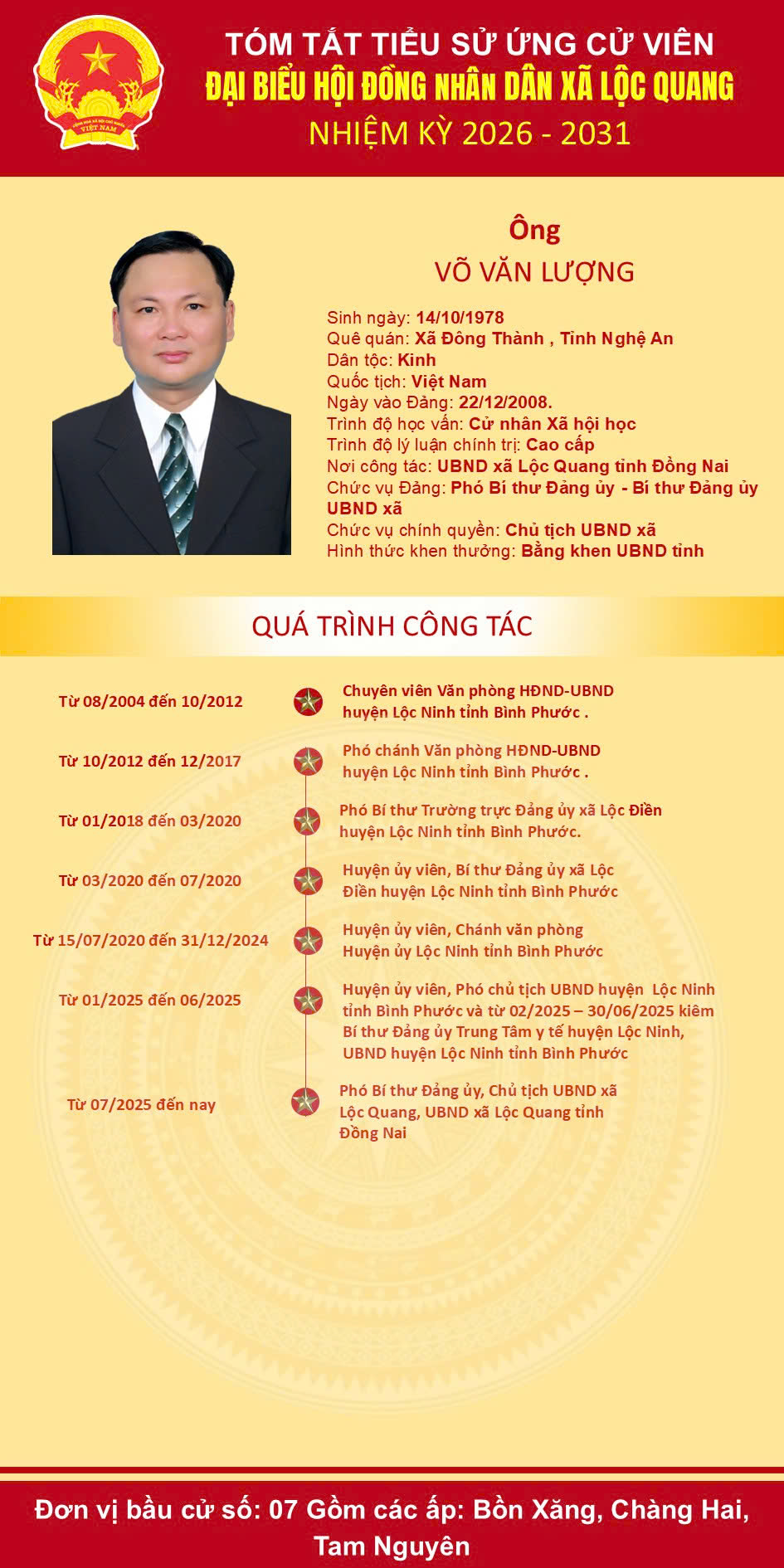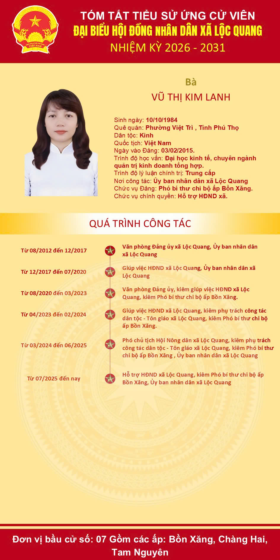 Ủy ban bầu cử xã Lộc Quang trân trọng giới thiệu tiểu sử tóm tắt của những người ứng cử Đại biểu HĐND xã nhiệm kỳ 2026-2031. Kính mời cử tri nghiên cứu kỹ tiểu sử của ứng cử viên để sáng suốt lựa chọn người đủ đức – đủ tài – đủ tâm đại diện cho ý chí, nguyện vọng của Nhân dân trong nhiệm kỳ mới.