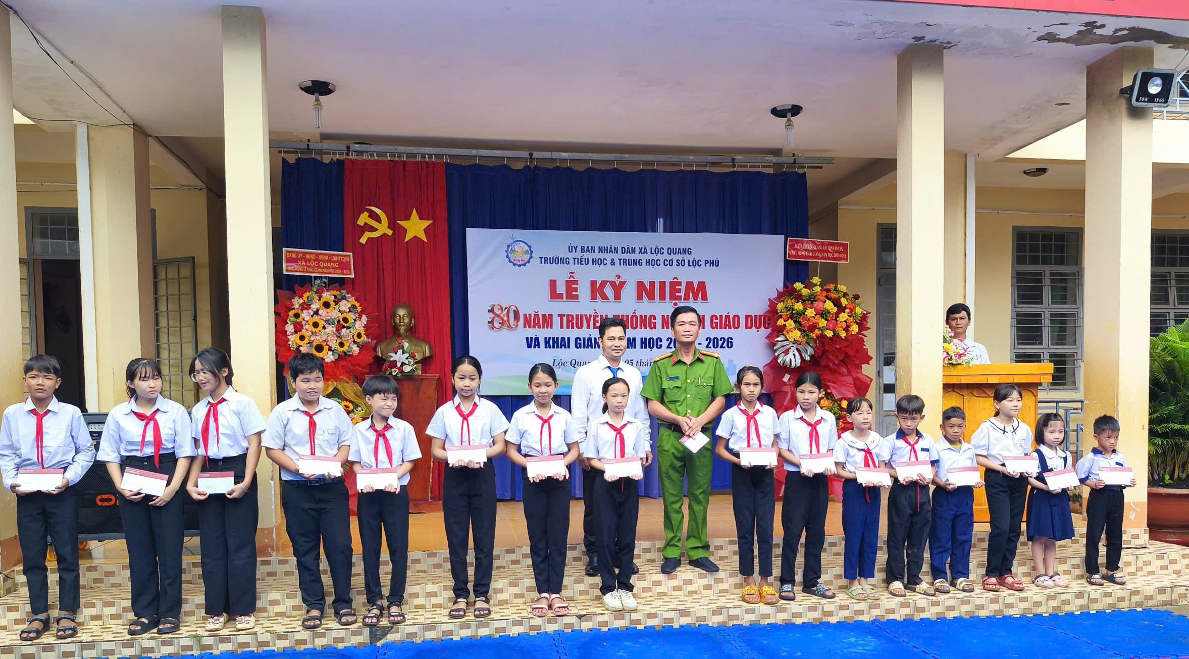 Dịp này, hội khuyến học Chữ Thập Đỏ xã gửi tặng 200 cuốn tập; Bảo hiểm Lộc Ninh gửi tặng 100 cuốn tập; Ngân hàng Agribank Lộc Quang gửi tặng 20 suất học bổng trị giá 10 triệu đồng; phụ huynh học sinh tặng 2 suất học bổng trị giá 1 triệu đồng; Mạnh thường quân tài trợ 15 phần quà trị giá 300.000đ/phần.
