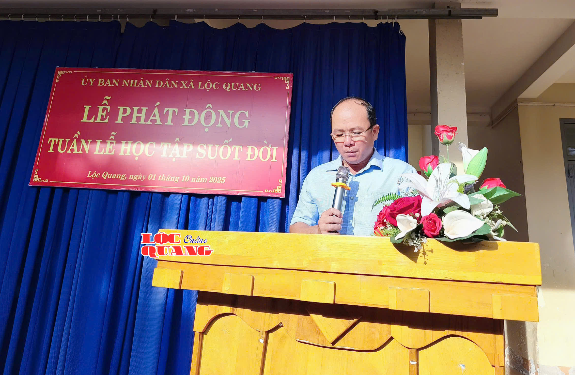 Sáng 1/10, UBND xã Lộc Quang đã tổ chức phát động Tuần lễ hưởng ứng học tập suốt đời năm 2025 tại trường TH&THCS Lộc Phú. Dự lễ phát động có ông Nguyễn Cao Thanh Sang - Phó Chủ tịch UBND xã; đại diện các ban, ngành, đoàn thể xã cùng toàn thể giáo viên và học sinh nhà trường.