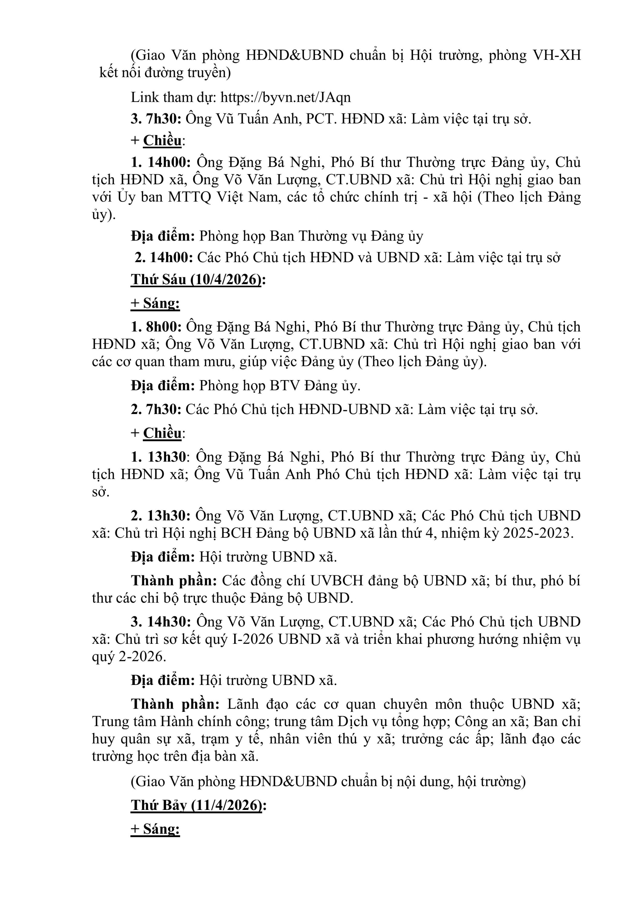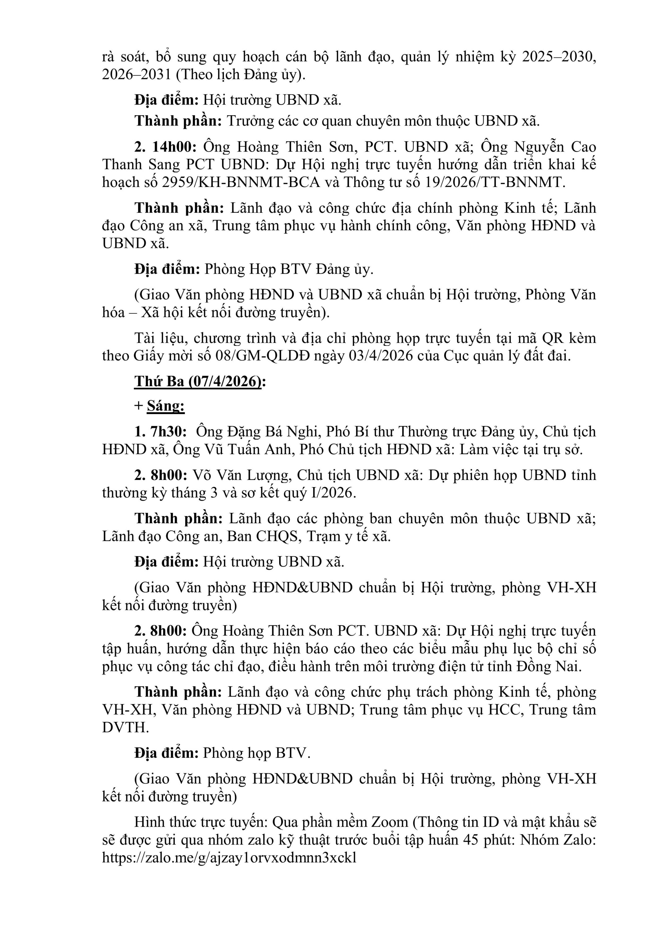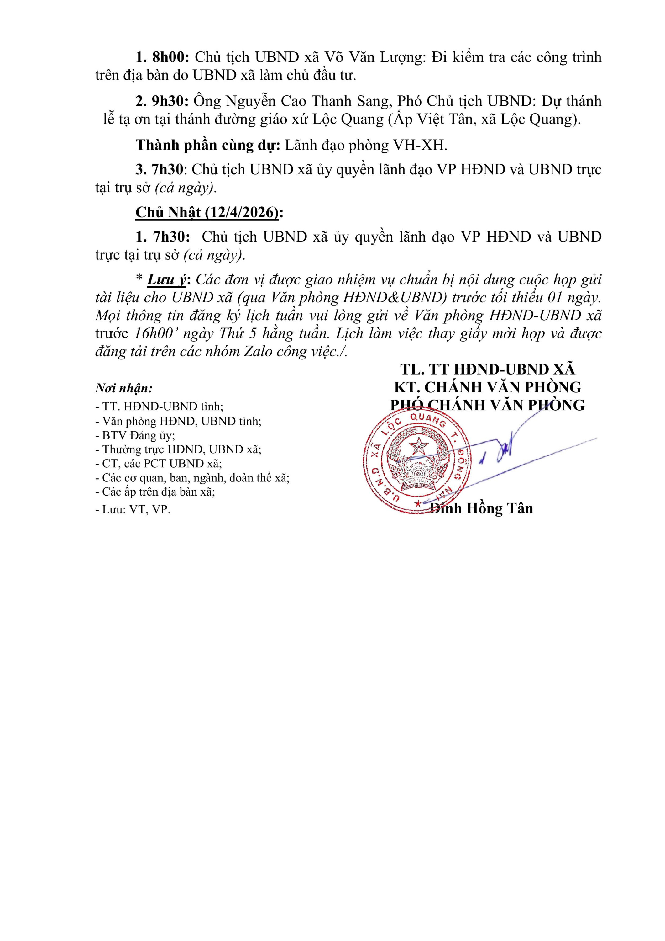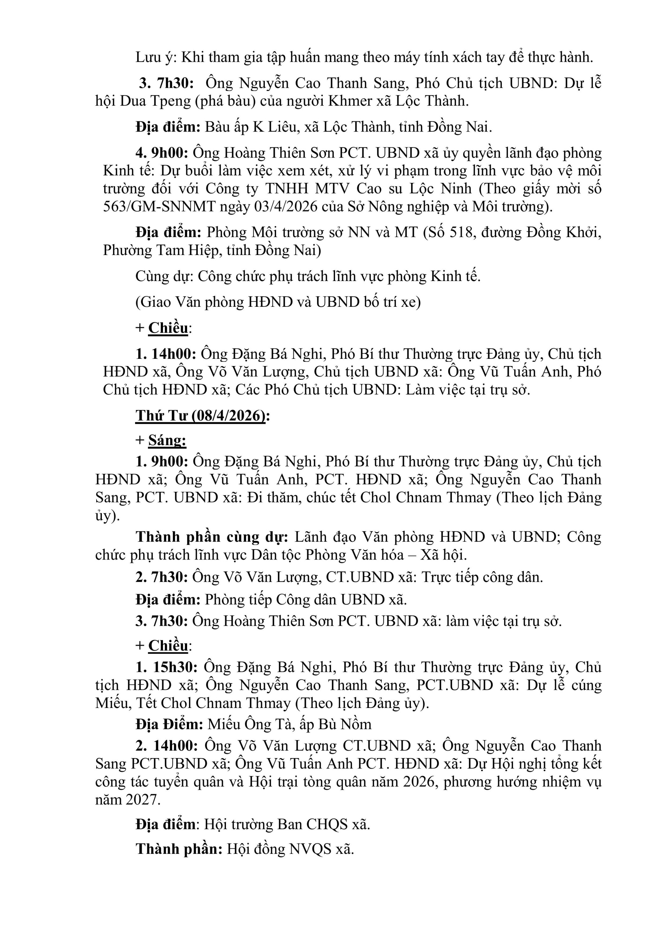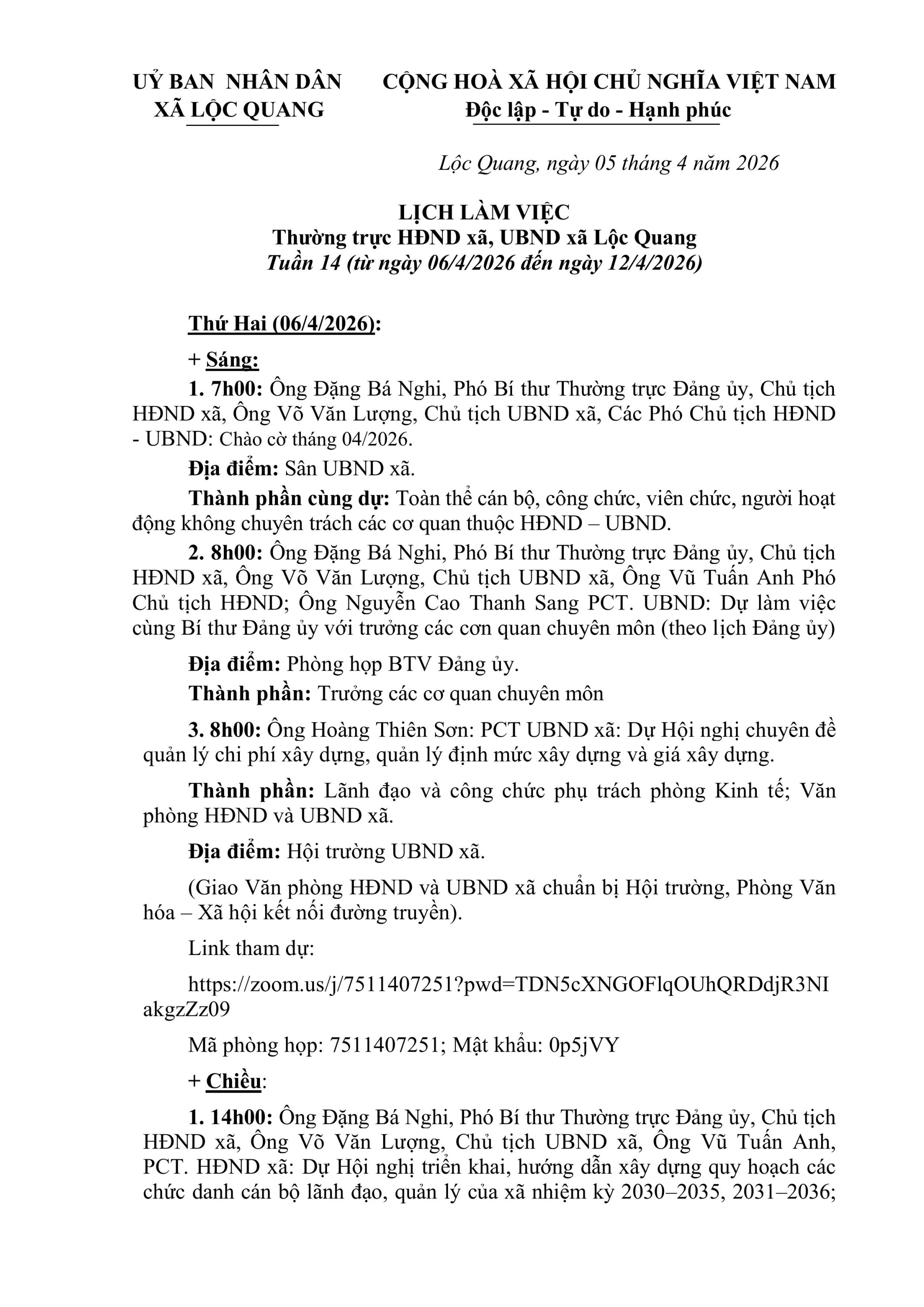 <p style="text-align:center;">LỊCH LÀM VIỆC Thường trực HĐND xã, UBND xã Lộc Quang Tuần 14 (từ ngày 06/4/2026 đến ngày 12/4/2026)</p><figure class="image"><img style="aspect-ratio:2122/3000;" src="https://locquang.dongnai.gov.vn/uploads/locquang/news/2026_04/lich-lam-viec-tuan-14-.signed.signed-hinh-anh-0.jpg" width="2122" height="3000" /></figure><figure class="image"><img style="aspect-ratio:2122/3000;" src="https://locquang.dongnai.gov.vn/uploads/locquang/news/2026_04/lich-lam-viec-tuan-14-.signed.signed-hinh-anh-1.jpg" width="2122" height="3000" /></figure><figure class="image"><img style="aspect-ratio:2122/3000;" src="https://locquang.dongnai.gov.vn/uploads/locquang/news/2026_04/lich-lam-viec-tuan-14-.signed.signed-hinh-anh-2.jpg" width="2122" height="3000" /></figure><figure class="image"><img style="aspect-ratio:2122/3000;" src="https://locquang.dongnai.gov.vn/uploads/locquang/news/2026_04/lich-lam-viec-tuan-14-.signed.signed-hinh-anh-3.jpg" width="2122" height="3000" /></figure><figure class="image"><img style="aspect-ratio:2122/3000;" src="https://locquang.dongnai.gov.vn/uploads/locquang/news/2026_04/lich-lam-viec-tuan-14-.signed.signed-hinh-anh-4.jpg" width="2122" height="3000" /></figure><figure class="image"><img style="aspect-ratio:2122/3000;" src="https://locquang.dongnai.gov.vn/uploads/locquang/news/2026_04/lich-lam-viec-tuan-14-.signed.signed-hinh-anh-5.jpg" width="2122" height="3000" /></figure>