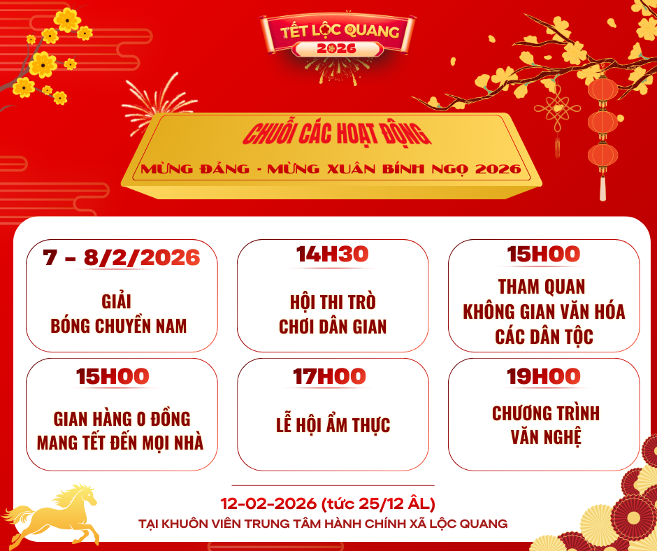 Bên cạnh đó, hội Xuân bùng nổ vào ngày 12/02/2026 (tức 25 Âm lịch) tại khuôn viên Trung tâm Hành chính xã với loạt hoạt động hấp dẫn, sẵn sàng khuấy động không khí, mang đến những trải nghiệm đáng nhớ và khoảnh khắc khó quên cho bà con nhân dân toàn xã, cụ thể: