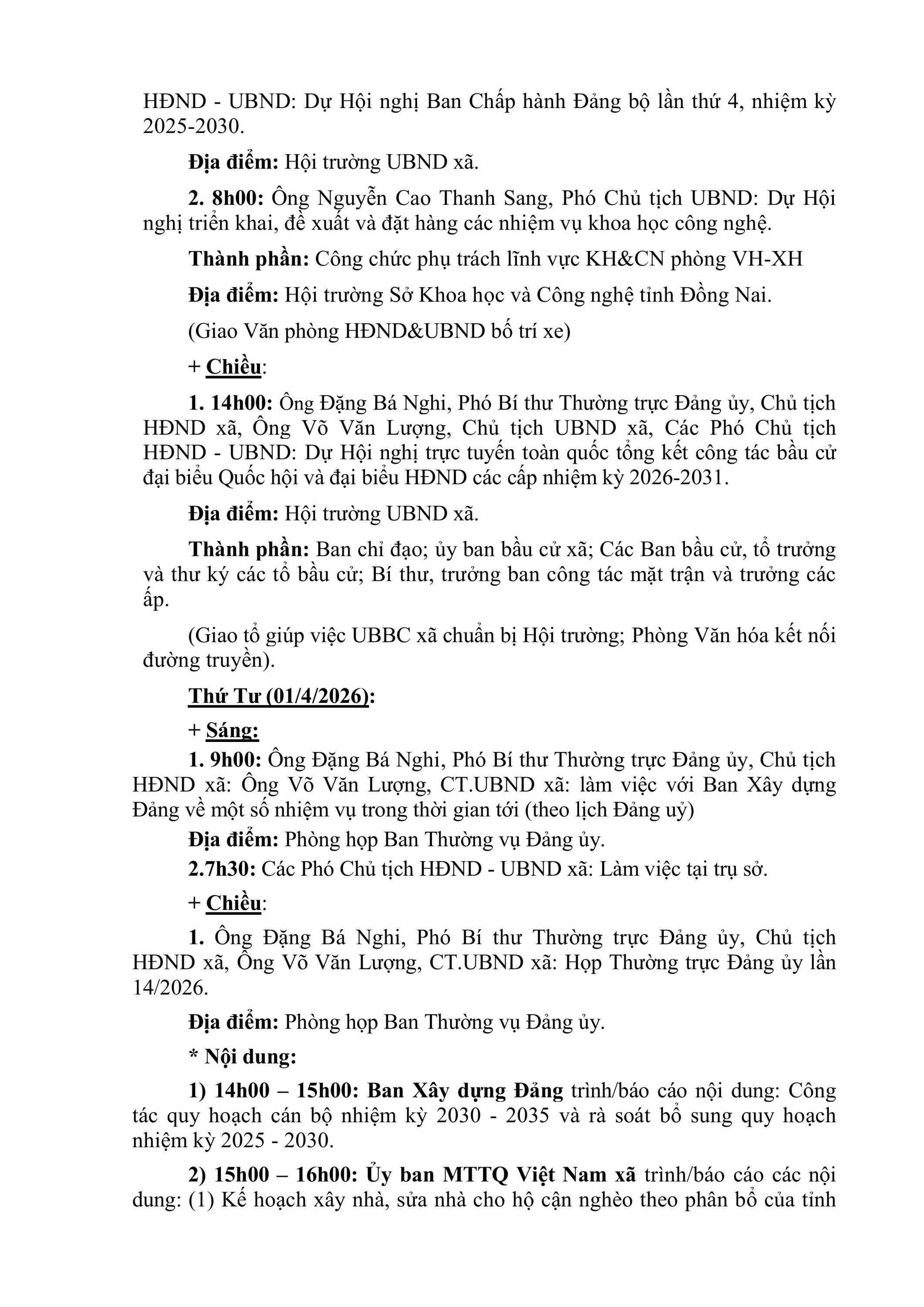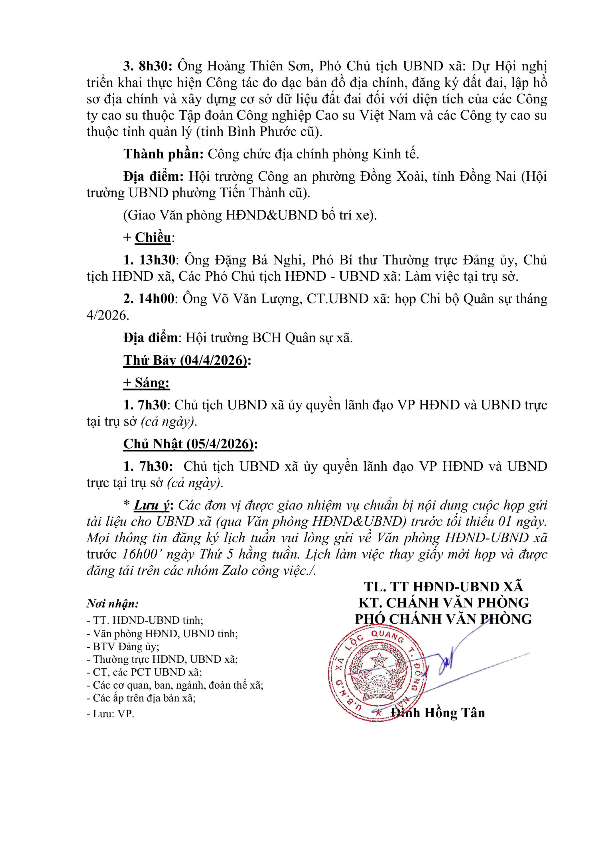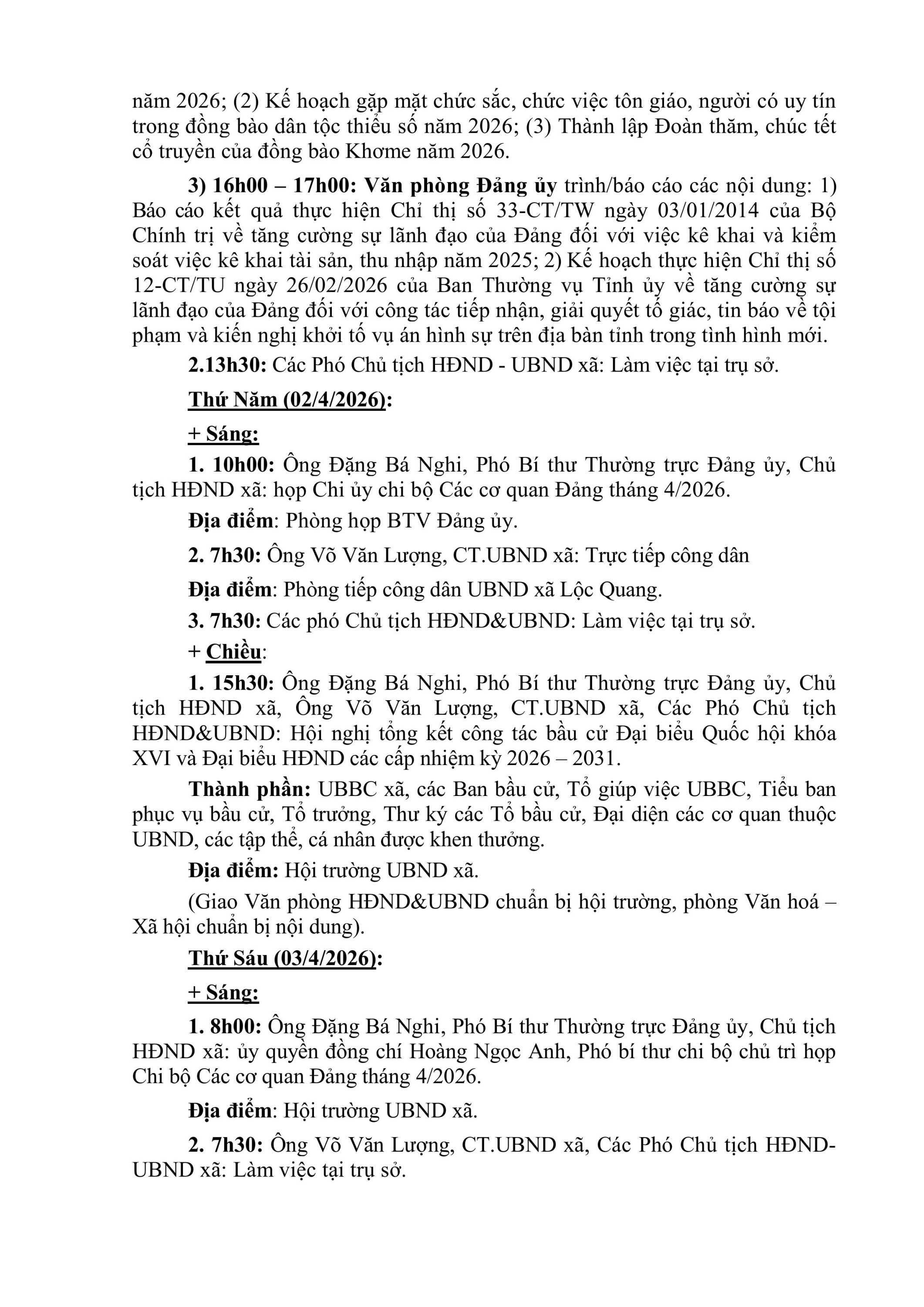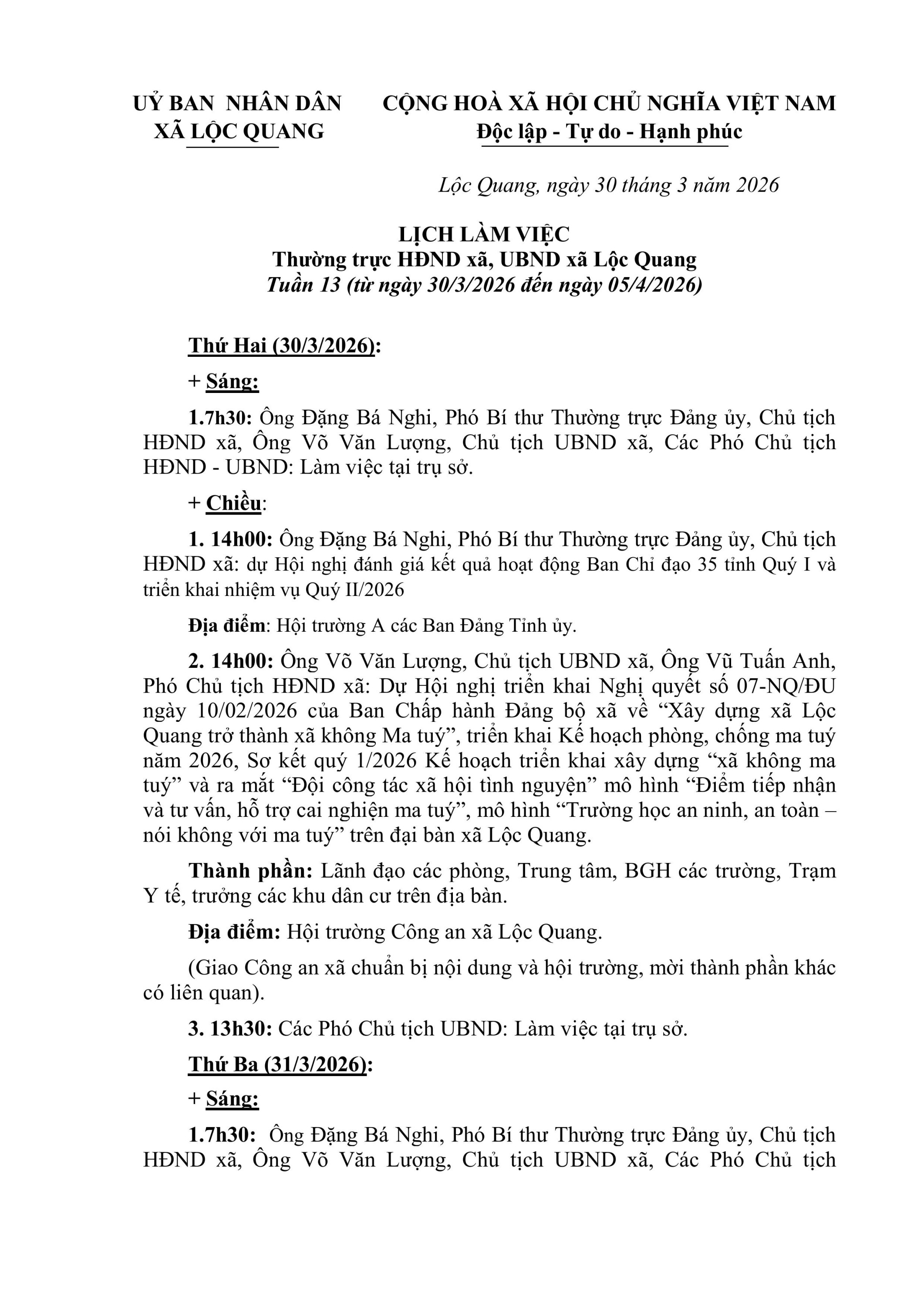 LỊCH LÀM VIỆC Thường trực HĐND xã, UBND xã Lộc Quang Tuần 13 (từ ngày 30/3/2026 đến ngày 05/4/2026)