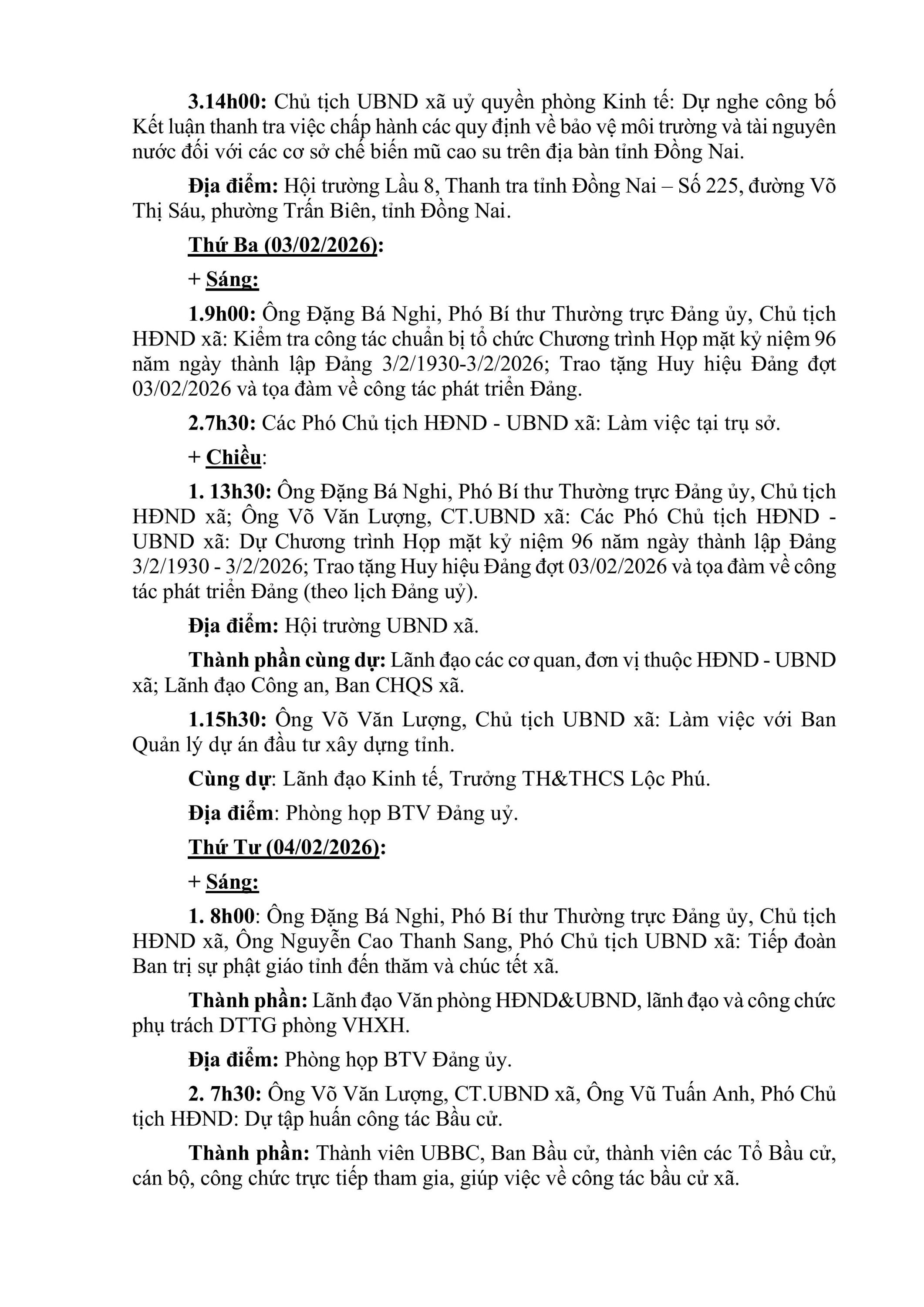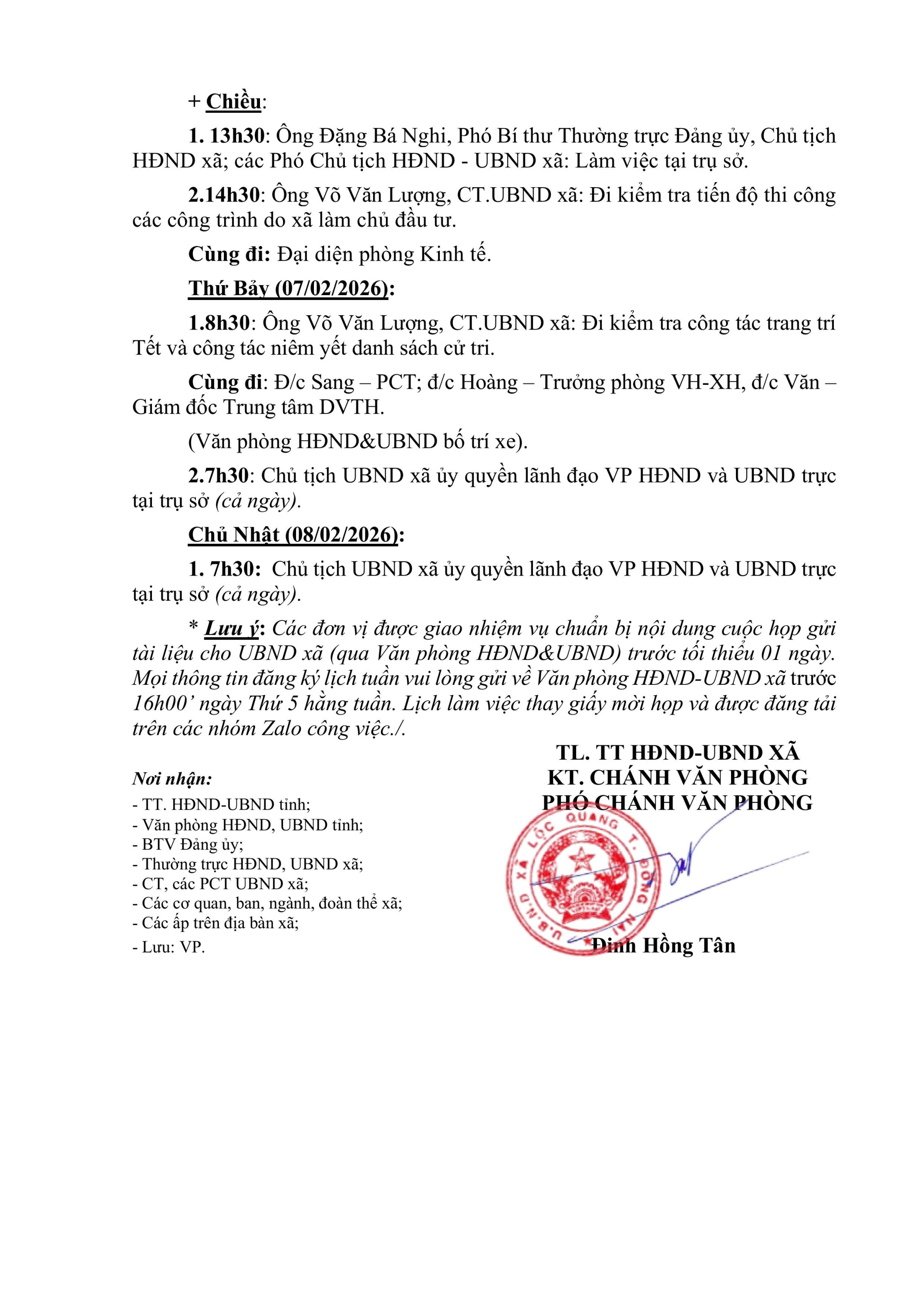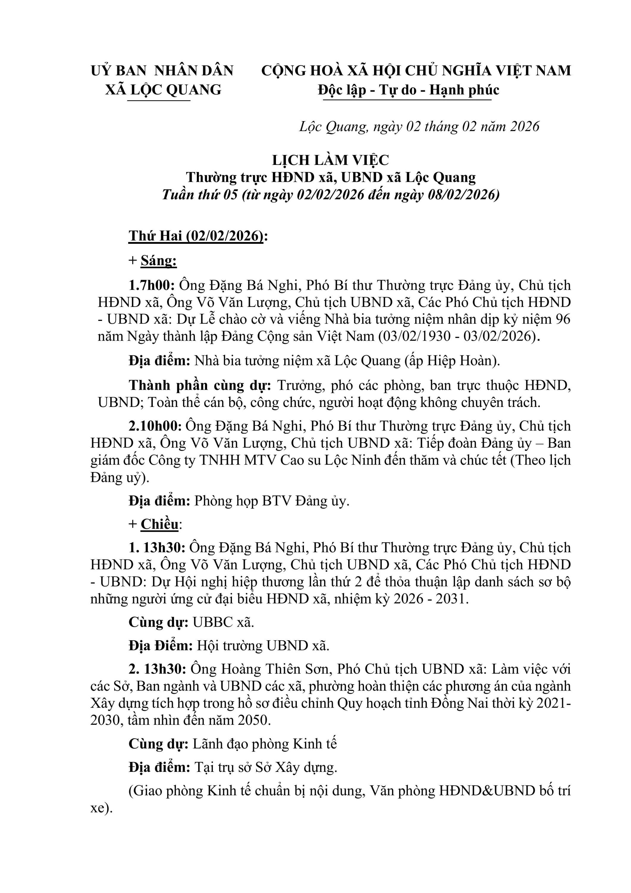 LỊCH LÀM VIỆC Thường trực HĐND xã, UBND xã Lộc Quang Tuần thứ 05 (từ ngày 02/02/2026 đến ngày 08/02/2026)