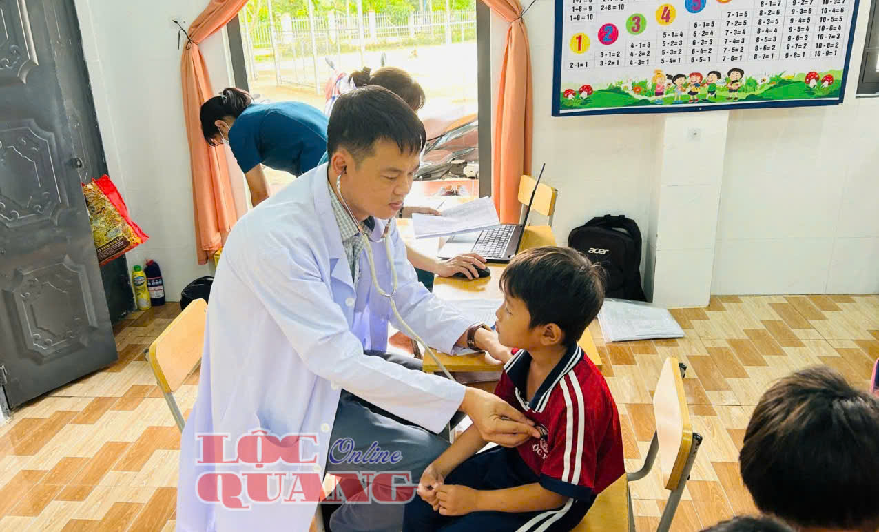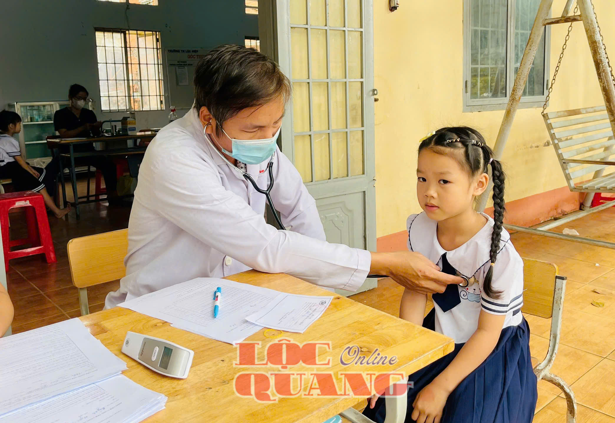 Cán bộ Trạm Y tế xã tiến hành khám sàng lọc và tiêm bù liều cho trẻ tại điểm trường Tiểu học Lộc Phú