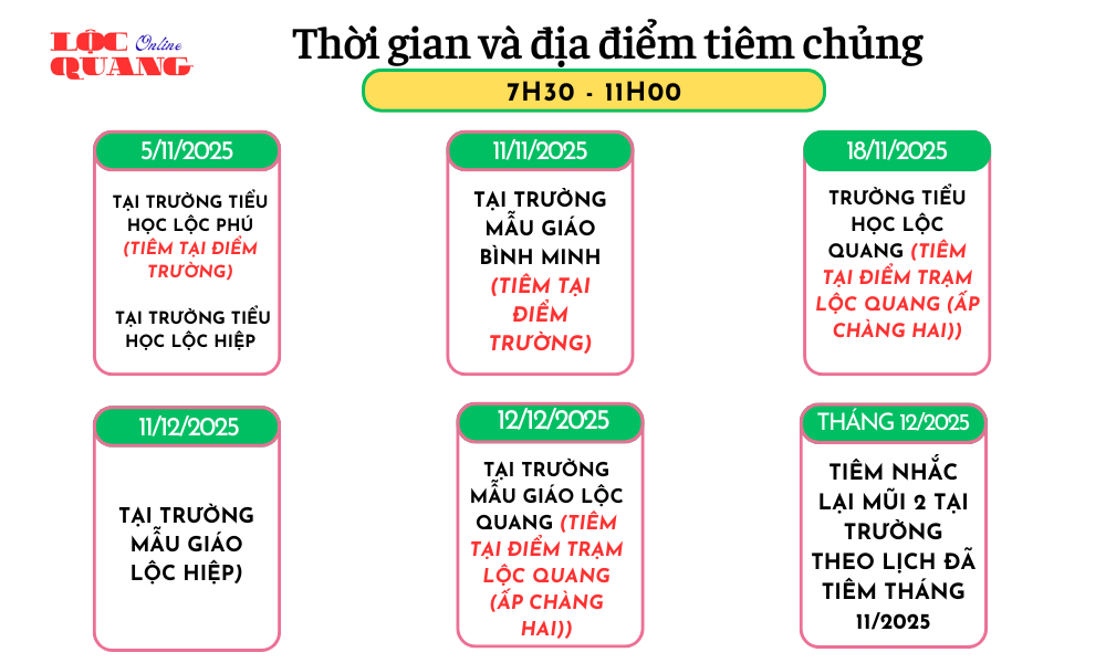 Nhằm đảm bảo tiêm chủng bù liều đầy đủ, tăng tỷ lệ bao phủ các loại vắc xin trong Chương trình Tiêm chủng mở rộng ở nhóm trẻ nhập học tại các cơ sở giáo dục mầm non, tiểu học, sáng 5-11, Trạm Y tế xã Lộc Quang tiến hành triển khai tiêm chủng bù liều cho trẻ mới nhập học tại các cơ sở giáo dục mầm non, tiểu học trên địa bàn xã.