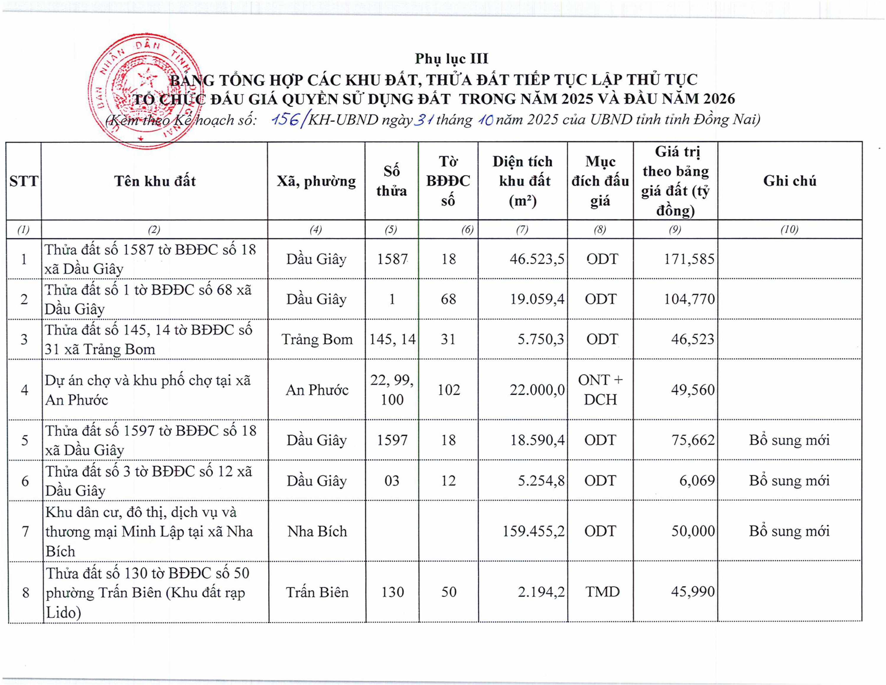 Ngày 31/10/2025, UBND tỉnh Đồng Nai đã ban hành Kế hoạch số 156/KH-UBND về đấu giá quyền sử dụng đất trên địa bàn tỉnh năm 2025.