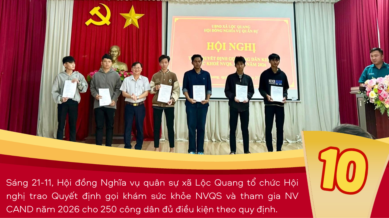 Mời bạn cùng điểm lại 10 sự kiện nổi bật đã diễn ra trong năm 2025. Đó là những dấu ấn đặc biệt đến từ sự chung sức, đồng lòng của Đảng bộ, Chính quyền và Nhân dân xã Lộc Quang! Nhìn lại hành trình của một năm qua, những đổi mới và sự phát triển đều được khởi nguồn từ tư duy "dám nghĩ, dám làm", tất cả vì một Lộc Quang ngày càng giàu đẹp, văn minh, nghĩa tình.