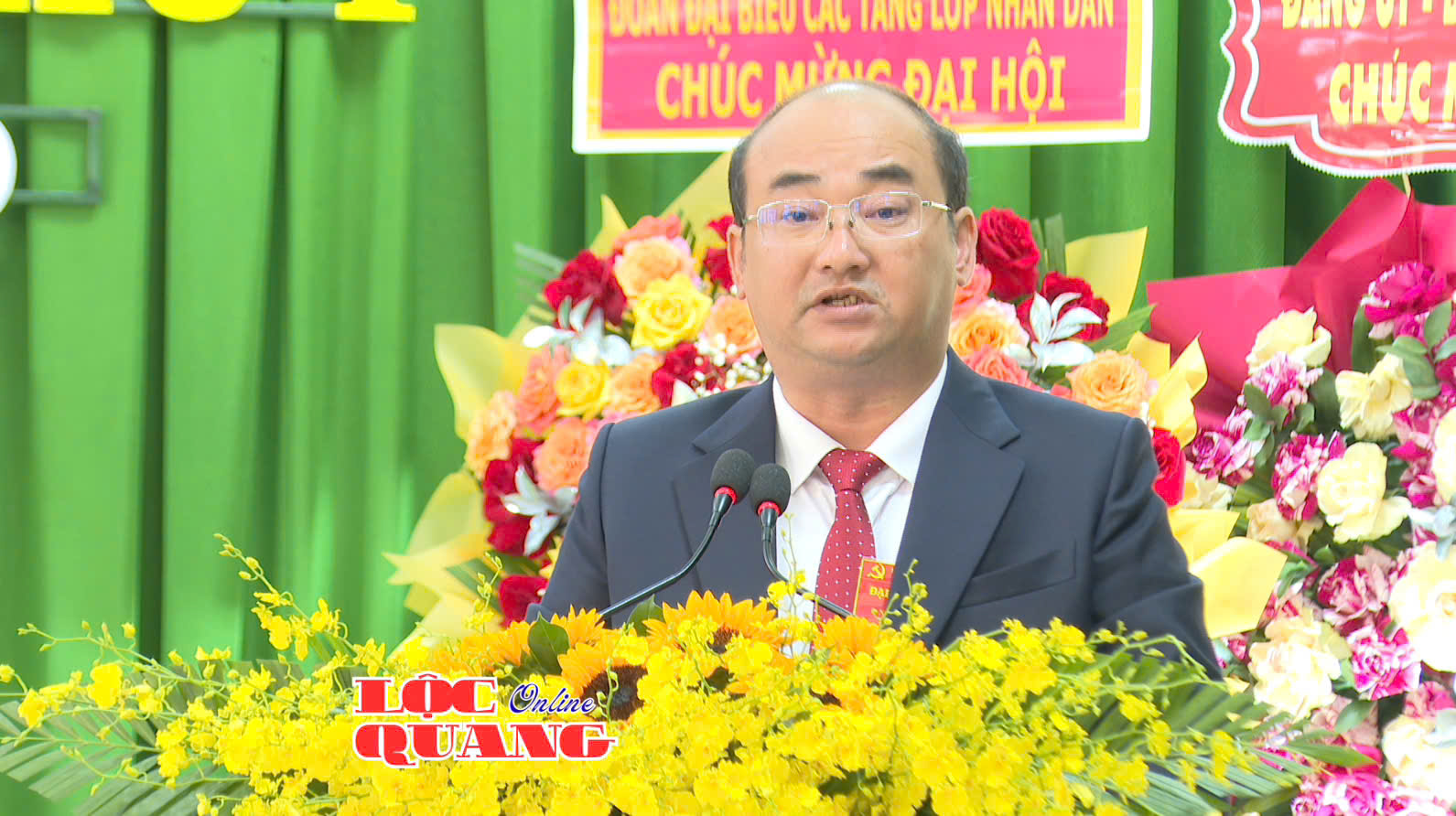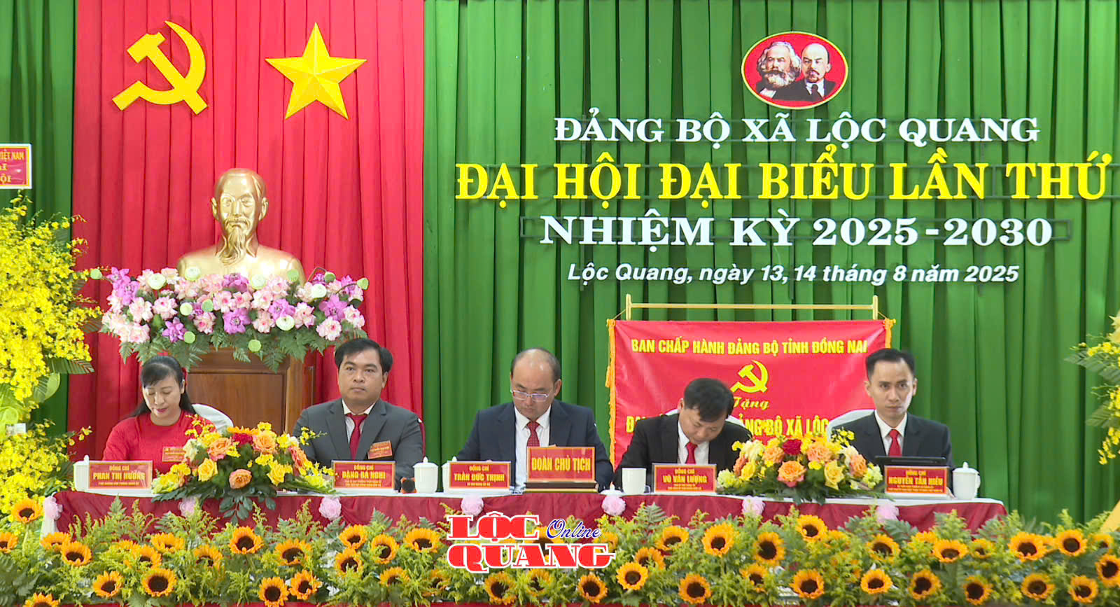 Đoàn Chủ tịch điều hành đại hội Phát biểu khai mạc đại hội, Bí thư Đảng uỷ xã Lộc Quang Trần Đức Thịnh cho biết: Sau sáp nhập, địa phương có nhiều lợi thế về vị trí kết nối vùng, giao thông thuận tiện, tiềm năng phát triển thương mại – dịch vụ, nông nghiệp công nghệ cao và một số ngành công nghiệp. Đây là thời cơ lớn để Đảng bộ xác định chiến lược phát triển phù hợp, khai thác hiệu quả các nguồn lực, đưa địa phương bứt phá trong kỷ nguyên hội nhập và đổi mới sáng tạo.Bí thư Đảng uỷ xã Lộc Quang Trần Đức Thịnh phát biểu khai mạc đại hội Tại đại hội, các đại biểu đã phát huy cao độ tinh thần trách nhiệm, trí tuệ tập thể, thảo luận dân chủ, đóng góp những ý kiến tâm huyết để Đại hội xác định đúng phương hướng, mục tiêu, giải pháp cho nhiệm kỳ 2025–2030, trong đó đặc biệt chú trọng 19 chỉ tiêu trọng tâm và 2 chỉ tiêu đột phá, phấn đấu đạt mức tăng trưởng hai con số, tạo chuyển biến mạnh mẽ, bền vững cho xã Lộc Quang. Ghi nhận những kết quả địa phương đạt được, Ủy viên Ban Thường vụ Tỉnh ủy, Phó Chủ tịch UBND tỉnh Lê Trường Sơn đề nghị Đảng bộ xã Lộc Quang nhiệm kỳ mới phát huy những thế mạnh, thành tựu đã đạt được, khắc phục các hạn chế đã được chỉ ra; khẩn trương xây dựng kế hoạch hành động để triển khai thực hiện các nghị quyết đại hội.Ủy viên Ban Thường vụ Tỉnh ủy, Phó Chủ tịch UBND tỉnh Đồng Nai Lê Trường Sơn phát biểu chỉ đạo đại hộiỦy viên Ban Thường vụ Tỉnh ủy, Phó Chủ tịch UBND tỉnh Đồng Nai Lê Trường Sơn trao bức trướng của Ban Chấp hành Đảng bộ tỉnh tặng đại hội Sau hai ngày làm việc khẩn trương, nghiêm túc, dân chủ và đầy trách nhiệm, Đại hội đại biểu Đảng bộ xã Lộc Quang lần thứ I, nhiệm kỳ 2025–2030 đã hoàn thành toàn bộ chương trình đề ra. Qua đó lan tỏa niềm tin, thể hiện sự quyết tâm, đồng lòng “xây dựng Đảng bộ và hệ thống chính trị trong sạch, vững mạnh; phát huy dân chủ, sức mạnh đại đoàn kết toàn dân; đảm bảo quốc phòng - an ninh; khai thác tiềm năng lợi thế; huy động mọi nguồn lực xây dựng xã Lộc Quang phát triển bền vững”./.