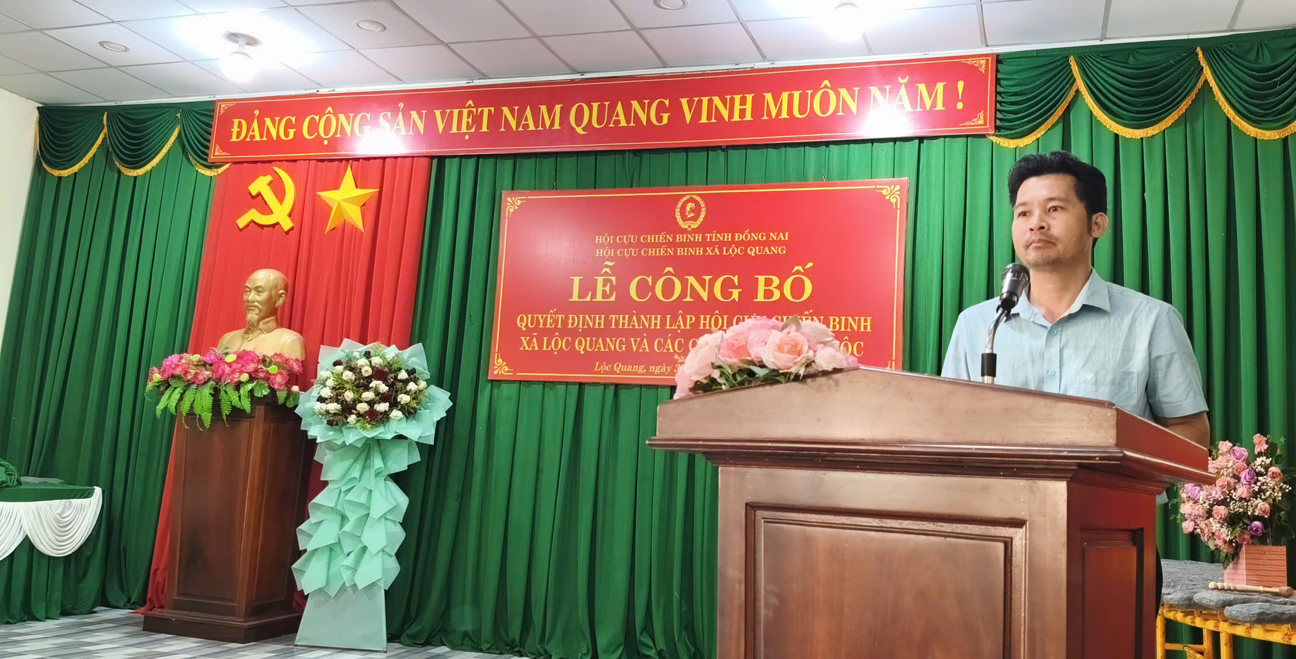 Chiều ngày 30/7, Ban Thường vụ Hội Cựu chiến binh xã Lộc Quang tổ chức lễ công bố Quyết định thành lập Hội Cựu chiến binh xã Lộc Quang và các Chi hội trực thuộc. Đến dự và chỉ đạo hội nghị có đồng chí Vũ Thành Long – PCT TT UBMTTQVN xã; các đồng chí trong ban chấp hành hội CCB xã, các đồng chí chi hội trưởng hội CCB các ấp. Hội Cựu chiến binh xã được thành lập theo Quyết định số 46/QĐ-CCB ngày 15 tháng 7 năm 2025 thuộc hội CCB tỉnh Đồng Nai. Đến nay hội có 554 hội viên sinh hoạt tại 20 chi hội. Việc kiện toàn tổ chức Hội CCB là yêu cầu cấp thiết nhằm bảo đảm hoạt động liên tục, hiệu quả. Hội cần tiếp tục thực hiện thực hiện tốt quy chế phối hợp với các tổ chức, tích cực tham gia xây dựng Đảng, bảo vệ chính quyền, bảo vệ nhân dân; đẩy mạnh phát triển kinh tế, góp phần giữ vững ổn định xã hội. Cùng với đó, Hội phát huy vai trò trong giáo dục truyền thống cách mạng, truyền ngọn lửa nhiệt huyết cho thế hệ trẻ.