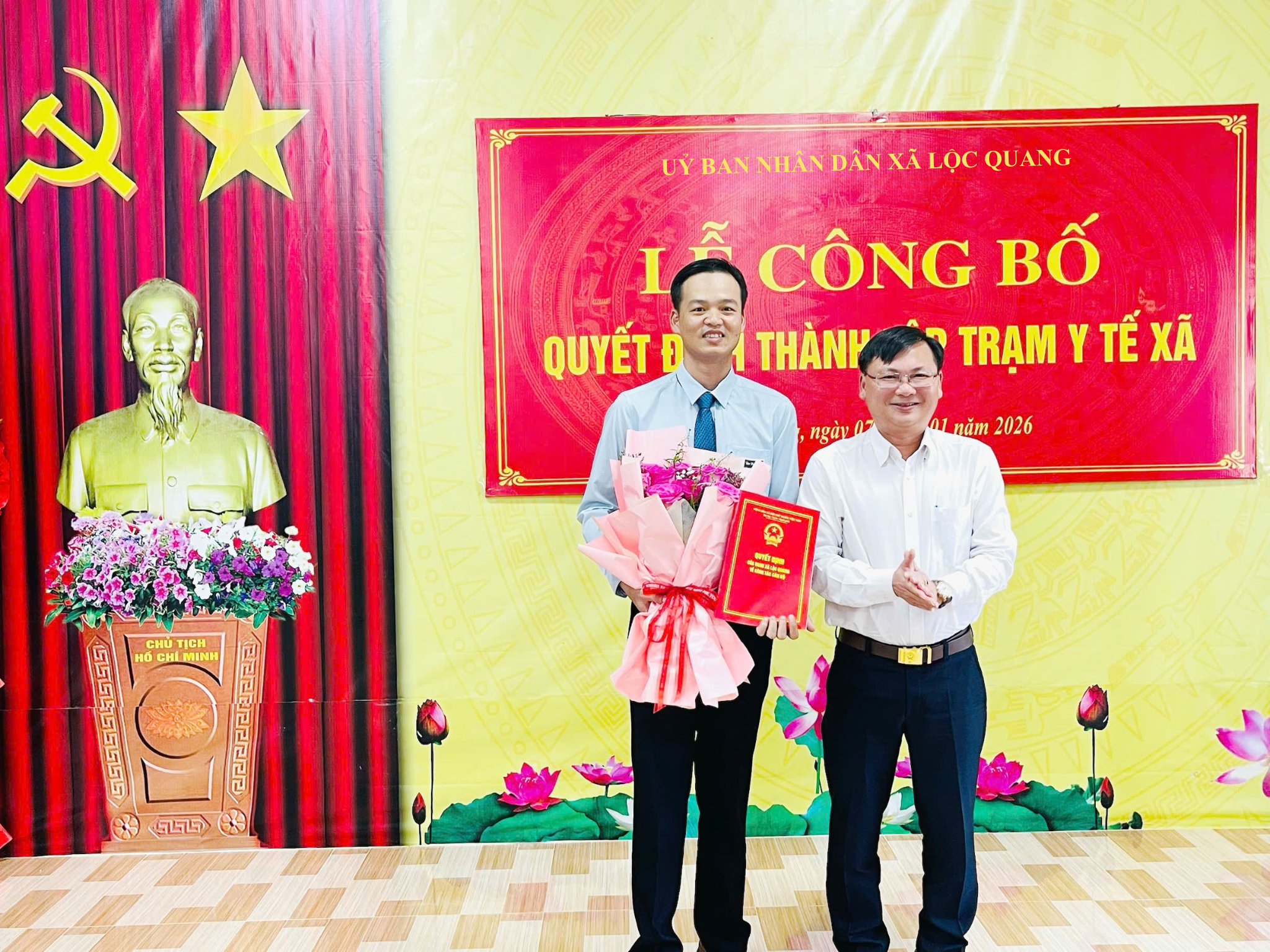 Tại buổi lễ, UBND xã đã công bố quyết định giao tạm thời phụ trách điều hành hoạt động Trạm Y tế xã Lộc Quang cho ông Trần Văn Thi kể từ ngày 01/01/2026 đến khi kiện toàn nhân sự Ban Giám đốc Trạm Y tế xã Lộc Quang theo quy định. Như vậy, hiện nay Trạm có 17 biên chế, sau khi thành lập Trạm tiếp nhận 1 biên chế từ Trung tâm Y tế khu vực Lộc Ninh trực thuộc Sở Y tế Đồng Nai chuyển đến công tác tại Trạm Y tế xã Lộc Quang kể từ ngày 01/01/2026, nhằm bảo đảm điều kiện tổ chức bộ máy và nâng cao chất lượng hoạt động chuyên môn.